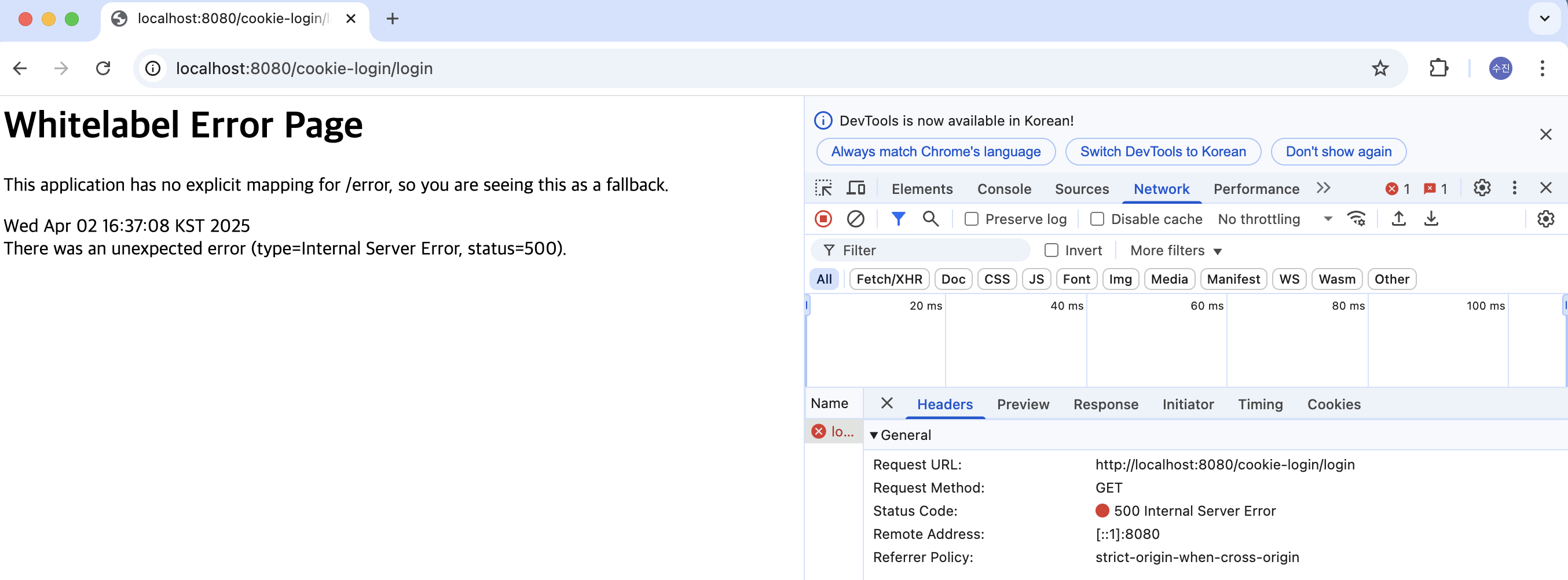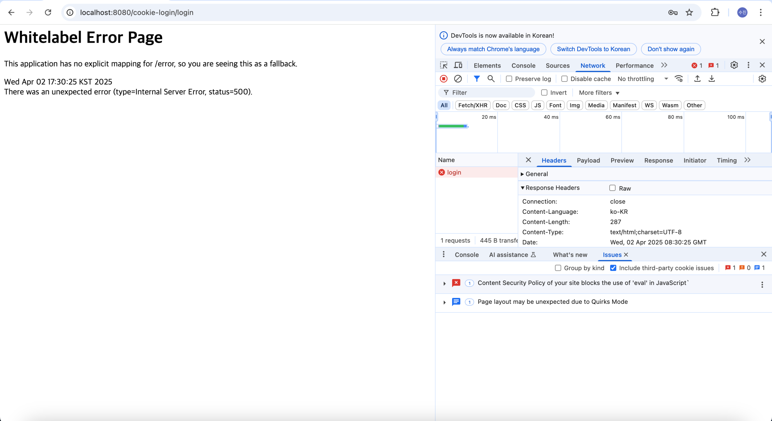3-1. [로그인/에러] 쿠키 로그인 시 500 에러 (whitelabel error page / 500)