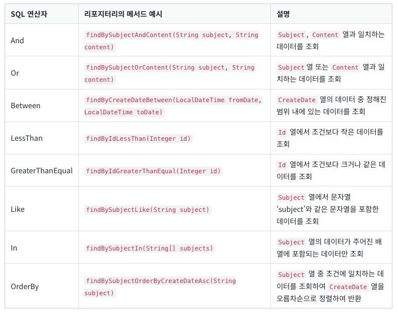 - 두 개의 열을 조회하기 위해서는 And 연산자 사용하면 됨 (ex. findBySubjectAndContent)